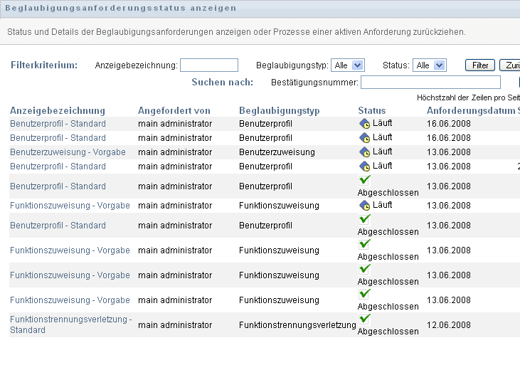 In der Benutzeranwendung bestehen keine Einschränkungen hinsichtlich der Informationen, die dem Konformitätsadministrator auf der Seite „Beglaubigungsanforderungsstatus anzeigen“ angezeigt werden. Diese Rolle erlaubt den Zugriff auf Statusinformationen zu allen Beglaubigungsanforderungen.