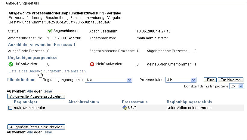 Mithilfe der Aktion können Sie den Status Ihrer Beglaubigungsanforderungen anzeigen. Zusätzlich haben Sie die Möglichkeit, den detaillierten Status aller Workflow-Prozesse anzuzeigen, die für eine Anforderung gestartet wurden, und optional einen oder mehrere laufende Prozesse zurückzuziehen.
