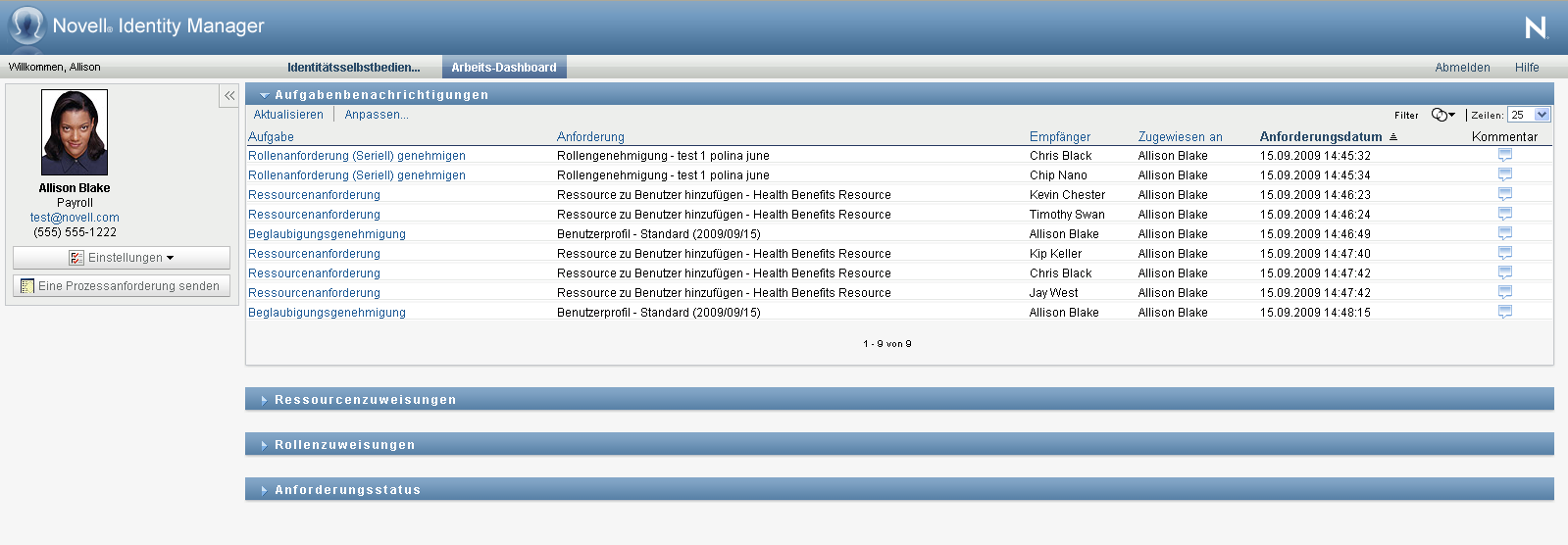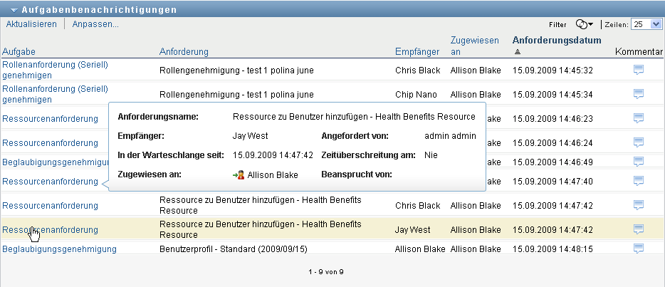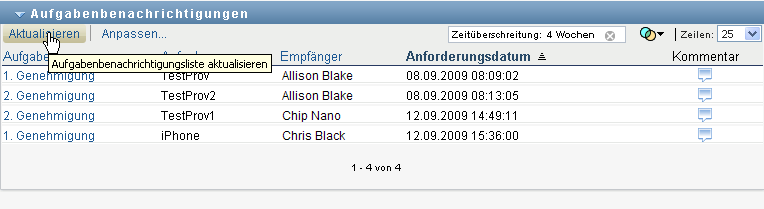 Bei Ressourcen- und Rollenanforderungen gibt die Spalte in der Aufgabenliste die Benutzer oder Gruppen an, die die Ressource bzw. Rolle erhalten, wenn die erforderlichen Genehmigungen erteilt werden. Für Beglaubigungsanforderungen gibt die Spalte den Namen des Beglaubigers an.