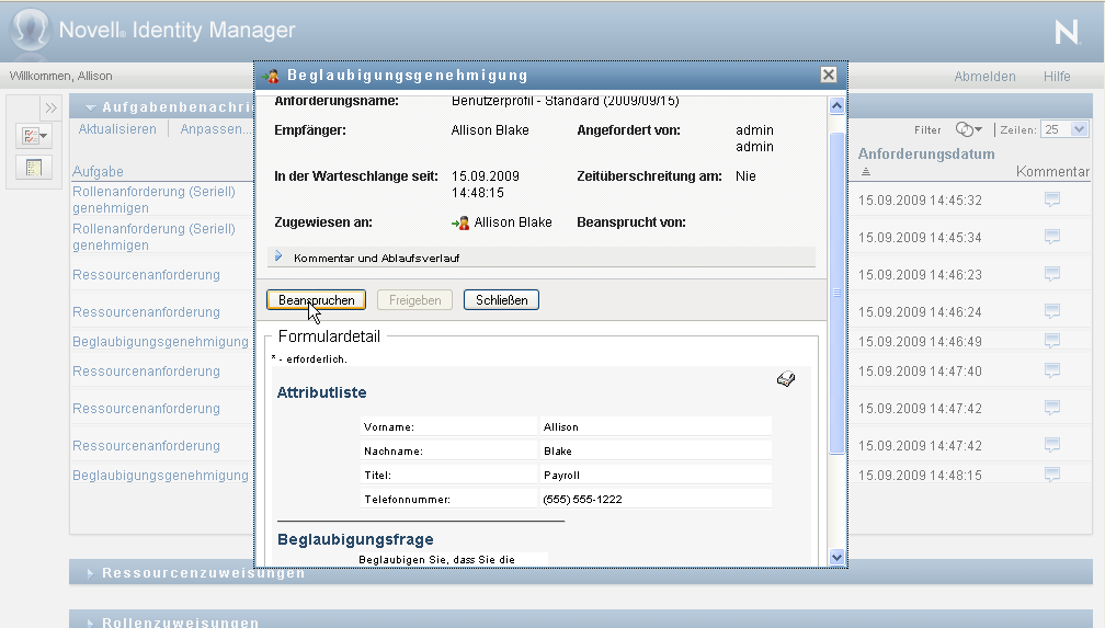 Wenn Sie eine Aufgabe beanspruchen, die mit einer Beglaubigungsanforderung verknüpft ist, müssen Sie die Informationen durchlesen, die im Beglaubigungsformular angezeigt werden. Zusätzlich müssen Sie die erforderliche Beglaubigungsfrage beantworten, wodurch Sie bestätigen, dass die Daten richtig sind. In einigen Fällen müssen auch eine oder mehrere Erfassungsfragen beantwortet werden. Bei Prozessen für die Benutzerprofilbeglaubigung umfasst das Formular die Benutzerattributdaten, die Sie auf ihre Richtigkeit hin überprüfen müssen. Bei Prozessen zur Rollenzuweisung, Benutzerzuweisung und Funktionstrennungsbeglaubigung enthält das Formular einen Bericht, in dem die zu prüfenden Rollenzuweisungs-, Benutzerzuweisungs- bzw. Funktionstrennungsdaten angezeigt werden.