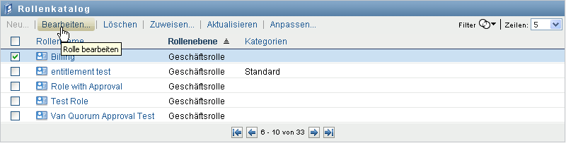 Die Aktion auf der Registerkarte der Identity Manager-Benutzeroberfläche ermöglicht Ihnen das Anzeigen von Rollen, die zuvor im Katalog definiert wurden. Darüber hinaus können Sie mit dieser Aktion neue Rollen erstellen und vorhandene Rollen bearbeiten, löschen und zuweisen.