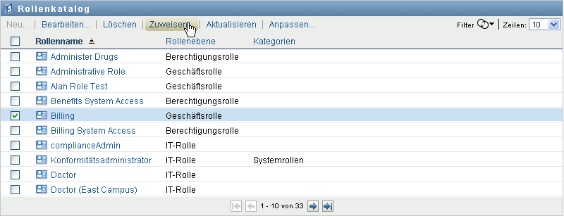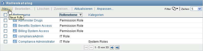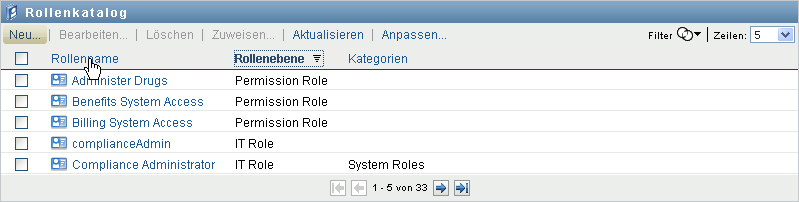 Die Benutzeranwendung zeigt eine Liste der derzeit im Katalog definierten Rollen an.