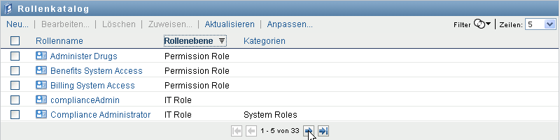 Sie können in der Rollenliste zu einer anderen Seite blättern, indem Sie im unteren Bereich der Liste auf die Schaltfläche „Weiter“, „Zurück“, „Erste“ oder „Letzte“ klicken: