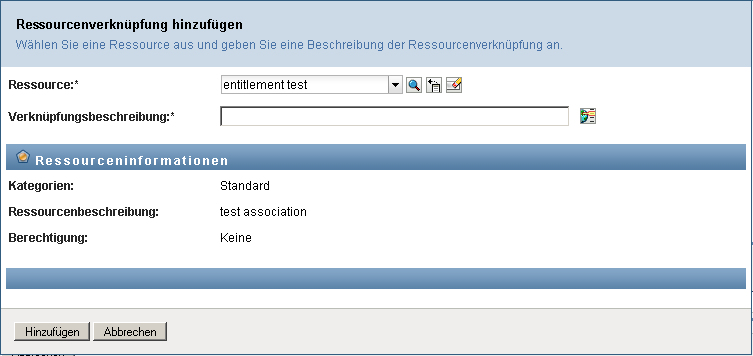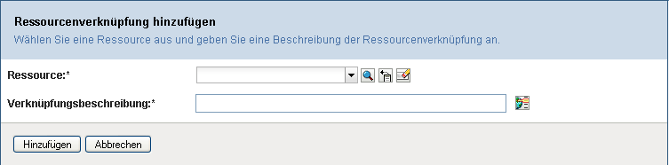 Mit der Objektauswahl können Sie die gewünschte Ressource auswählen und Text angeben, der den Grund für die Verknüpfung erläutert.