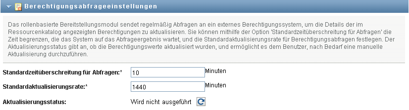 Diese Einstellungen steuern das Verhalten der Berechtigungsabfragen, die von der Benutzeranwendung ausgeführt werden. Sie können ein Zeitüberschreitungsintervall und eine Aktualisierungsrate für Berechtigungsabfragen festlegen. Darüber hinaus können Sie sehen, ob die Berechtigungswerte aktualisiert wurden, und bei Bedarf eine manuelle Aktualisierung starten.