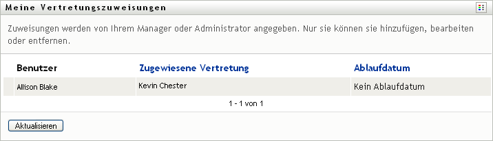 Die Benutzeranwendung zeigt Ihre aktuellen Einstellungen an. Es werden die Vertretungszuweisungen angezeigt, bei denen Sie als Vertretung einer anderen Person angegeben sind, sowie die Zuweisungen, die Sie als Vertretung einer anderen Person definieren.