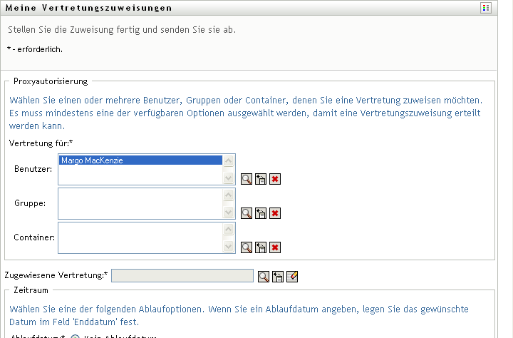 Wenn Sie ein Bereitstellungsadministrator sind, wählen Sie einen oder mehrere Benutzer, Gruppen oder Container aus, denen Sie eine Vertretung zuweisen möchten.