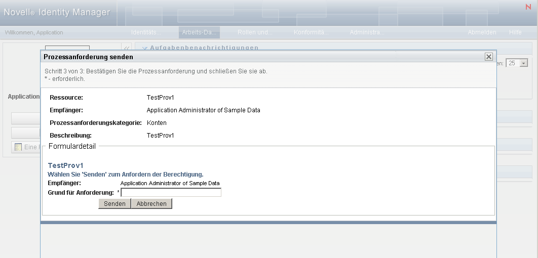 Nachdem eine Anforderung gesendet wurde, wird sie in der Liste der Anforderungen angezeigt, die der Anforderer im Arbeits-Dashboard unter sieht. Darüber hinaus wird die Aufgabe dem Genehmiger im Arbeits-Dashboard unter angezeigt.