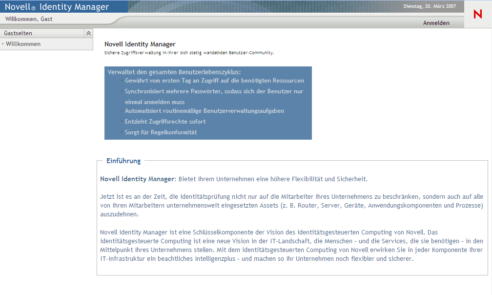 Wenn die erste Seite Ihrer Identity Manager-Benutzeranwendung anders aussieht, wurde die Anwendung vermutlich an die Anforderungen Ihrer Organisation angepasst. Bei Ihrer Arbeit werden Sie möglicherweise feststellen, dass auch andere Funktionen der Benutzeranwendung geändert wurden.