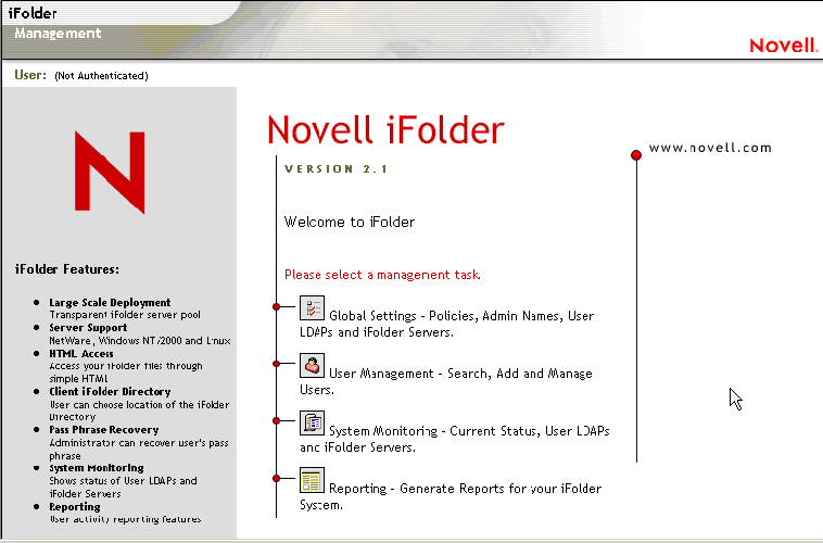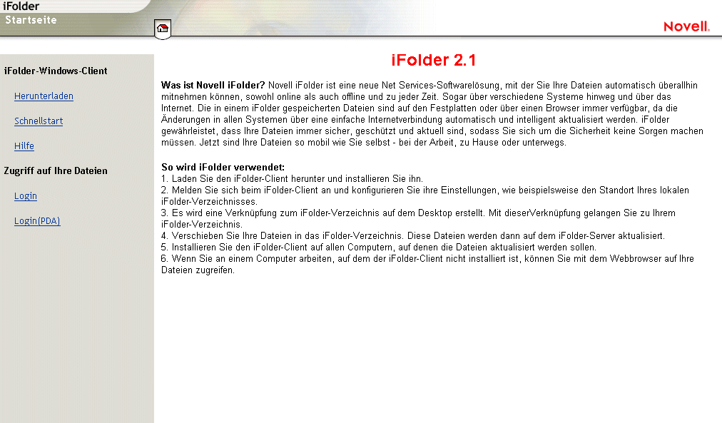 Nach der Installation von iFolder auf dem Server erhalten Sie den Zugriff auf die folgenden beiden Websites: