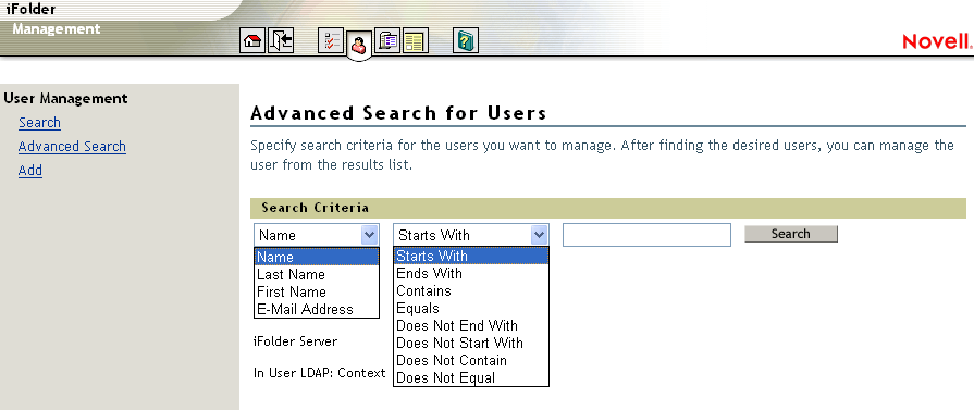 In der iFolder-Verwaltungskonsole steht die Funktion "Advanced Search" (Erweiterte Suche) zur Verfügung. Anhand der folgenden Suchkriterien können Sie Ihre Suche eingrenzen: