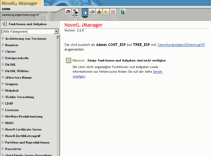 Informationen zu der Seite, auf der Sie sich gerade befinden, an.Informationen zur Änderung der Standardansicht "Funktionen und Aufgaben" finden Sie unter Konfigurieren und Anpassen von iManager.