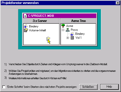 Die Hauptarbeit erfolgt im Projektfenster, in dem NetWare 3-Bindery-Objekte und Volume-Daten durch Ziehen und Ablegen in NDS-Container im NDS-Zielbaum verschoben werden können.