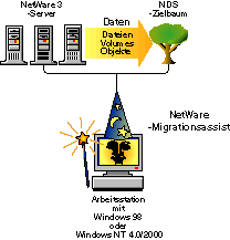 Der Novell® NetWare®-Migrationsassistent 6 kopiert und konsolidiert die NetWare 3-Bindery und das NetWare 3-Dateisystem von einem oder mehreren vorhandenen NetWare 3-Server(n) in einen NDS®-Zielbaum.