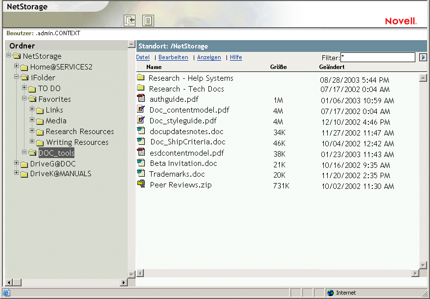 Wenn auf Ihrem System Novell NetStorage-Services verfügbar sind, kann der Verwalter NetStorage so konfigurieren, dass der Datenzugriff in iFolder unterstützt wird. Novell NetStorage ist in der Paketversion von iFolder 2.1.x mit NetWare® 6.5 und höher und mit Novell NterpriseTM Linux Services verfügbar.