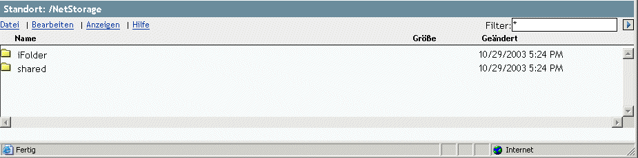 NetStorage (Ordneransicht): Besuchen Sie die folgende URL und melden Sie sich anschließend für den Zugriff auf Ihre iFolder-Dateien an. Die Ordneransicht verwendet auf der Webseite Rahmen, um die Dateiverwaltungsoptionen anzuzeigen.