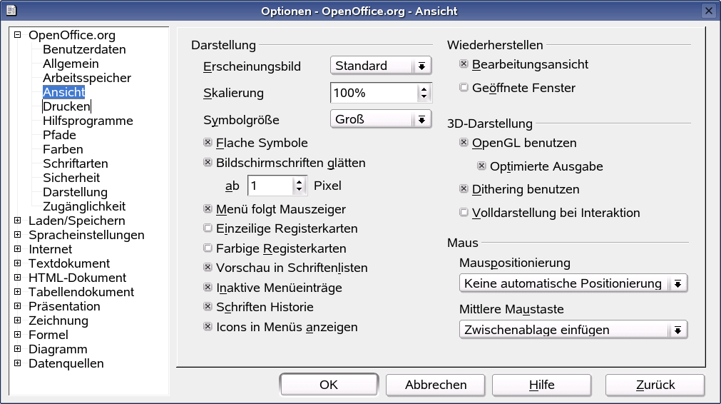 OpenOffice.org: Deckt unterschiedliche grundlegende Einstellungen ab. Dazu gehören Ihre Benutzerdaten (wie Ihre Adresse und E-Mail), wichtige Pfade sowie Einstellungen für Drucker und externe Programme.