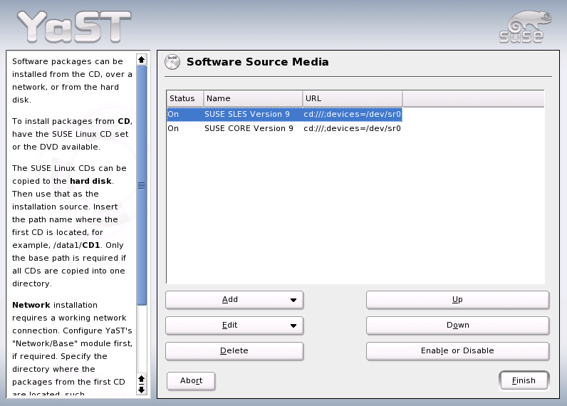 When this module starts, it displays a list of all previously registered sources. Following a normal installation from CD, only the installation CD is listed. Click Add to include additional sources in this list. You can add removable media, such as CDs, and network servers, such as NFS and FTP. Even directories on the local hard disk can be selected as the installation medium. See the detailed YaST help text.