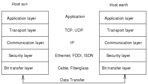 The diagram provides one or two examples for each layer. As you can see, the layers are ordered according to abstraction levels. The lowest layer is very close to the hardware. The uppermost layer, however, is almost a complete abstraction from the hardware. Every layer has its own special function. The special functions of each layer are mostly implicit in their description. The bit transfer and security layers represent the physical network used (such as ethernet).