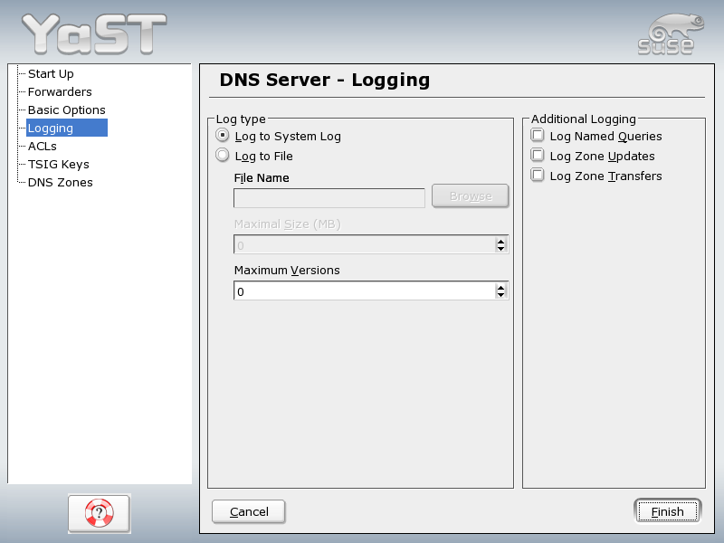 This section allows you to set options concerning the contents and the location of the DNS server's log data. Under Log Type, specify where the DNS server should write its log data. Use the system-wide log file /var/log/messages by selecting Log to System Log orspecify a different file by selecting Log to File. In the latter case, additionally specify the maximum file size in megabytes and the number of log files to store.