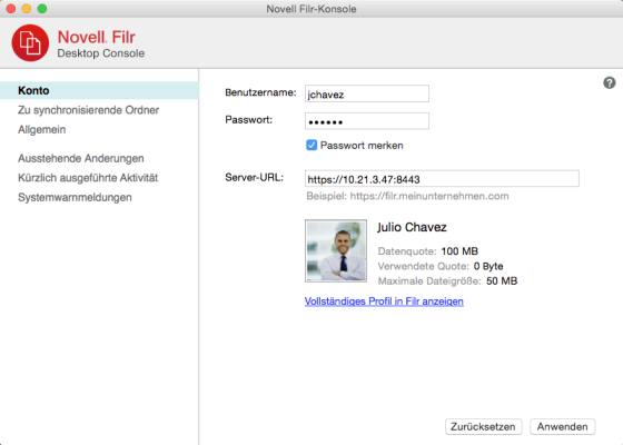 Server-URL: Geben Sie die URL für die Filr-Site an, über die Sie Dateien mit Ihrem Computer synchronisieren möchten. Zum Beispiel: https://Filr.meinunternehmen.com:8443.