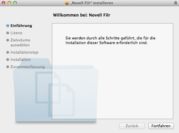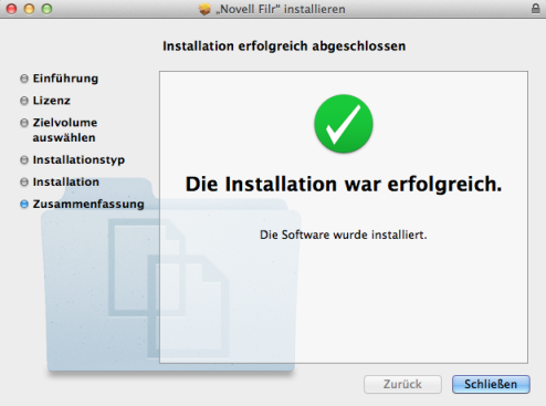 Nach Beenden des Herunterladens wird die Datei NovellFilr-Version.pkg geöffnet.