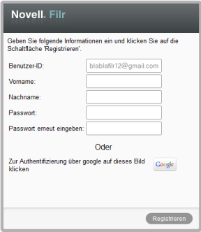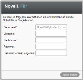 Wenn die Email-Adresse des Benutzers keine Google- oder Yahoo!-Adresse ist, sondern zum Beispiel eine Unternehmens-Email-Adresse (z. B. „peter@novell.com“), muss der Benutzer sich auf der Filr-Site registrieren, um sich anmelden zu können.