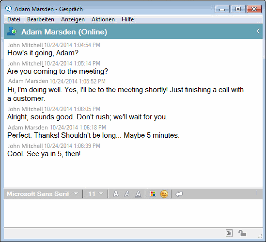 Ihr Gesprächsverlauf wird auf allen Geräten oder Computern gespeichert, an denen Sie zum Zeitpunkt des Gesprächs bei Novell Messenger angemeldet waren. Wenn Sie während des Gesprächs auf mehreren Geräten bei Messenger angemeldet waren, wird der Verlauf für dieses Gespräch auf allen Geräten gespeichert. Falls Sie während des Gesprächs nur auf einem einzigen Gerät angemeldet waren, ist der Verlauf nur auf diesem Gerät verfügbar.