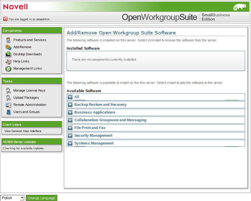 Mithilfe dieser Schnittstelle können Sie Komponenten auf Ihrem Server hinzufügen oder entfernen. Wählen Sie im linken Bereich der NOWS SBE-Verwaltungsseite unter dem Abschnitt die Option . Klicken Sie unter auf . Eine Liste mit möglichen Komponenteninstallationen wird angezeigt. Um eine Komponente zu installieren, klicken Sie auf die Schaltfläche für diese Komponente.