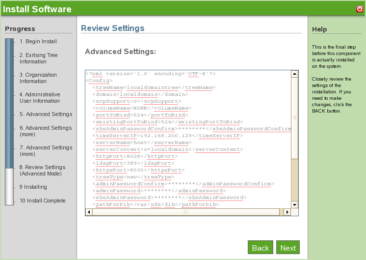 Überprüfen Sie die Einstellungen. Sie können Änderungen vornehmen, indem Sie den XMPL-Text direkt bearbeiten, um bei Bedarf zusätzliche erweiterte Einstellungen festzulegen. Um die Installation fortzusetzen, klicken Sie auf .