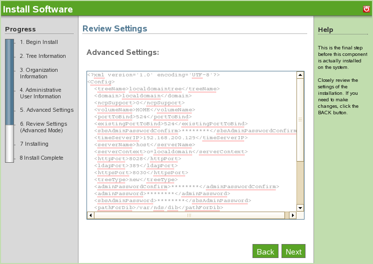 Überprüfen Sie die Einstellungen. Sie können Änderungen vornehmen, indem Sie den XMPL-Text direkt bearbeiten, um bei Bedarf zusätzliche erweiterte Einstellungen festzulegen. Um die Installation fortzusetzen, klicken Sie auf .