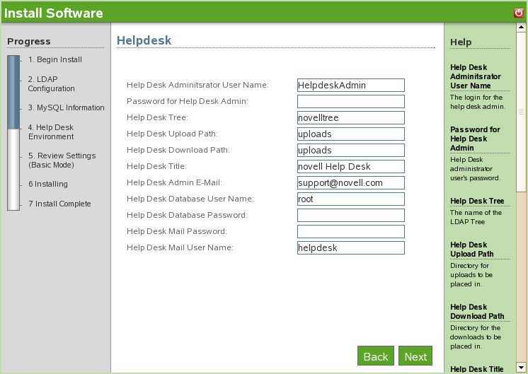Nachdem Sie das NOWS-SBE-Serverbetriebssystem und die Basiskomponente, eDirectory, installiert haben, können Sie die Helpdesk-Anwendung über die grafische NOWS-Verwaltungs-Benutzeroberfläche installieren.
