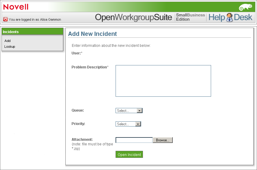 Ein Helpdesk-Benutzer verfügt in der Helpdesk-Anwendung über die grundlegendsten Zugriffsrechte. Ein Benutzer kann lediglich auf den Menübereich Vorfälle zugreifen. In diesem Bereich können Benutzer einen Helpdesk-Auftrag hinzufügen oder danach suchen. Nach der Anmeldung gelangen die Helpdesk-Benutzer zur Seite „Neuen Vorfall hinzufügen“.