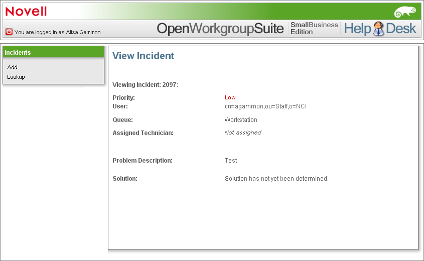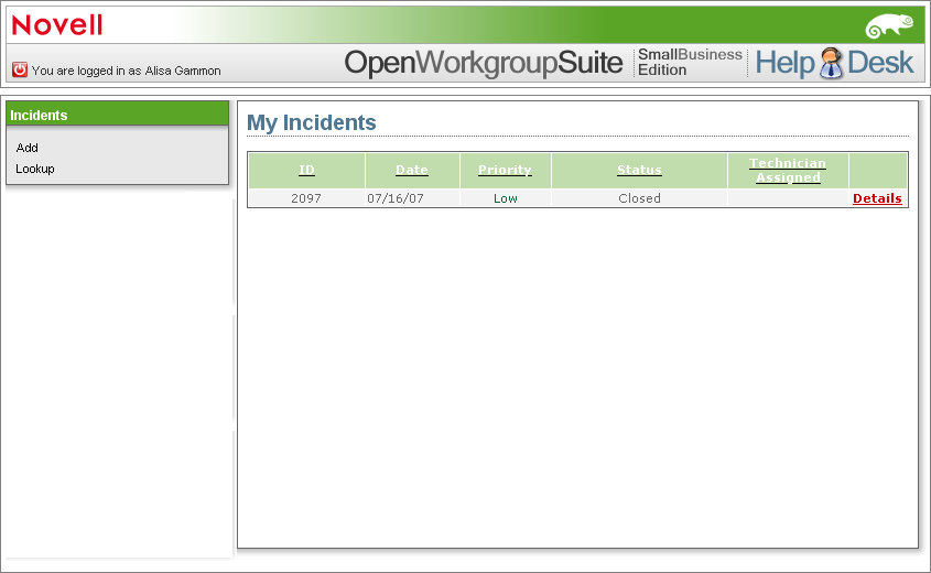 3. Klicken Sie auf Details, um Einzelheiten zu dem von Ihnen ausgewählten Helpdesk-Auftrag anzuzeigen. Daraufhin gelangen Sie zur Seite Vorfälle anzeigen.