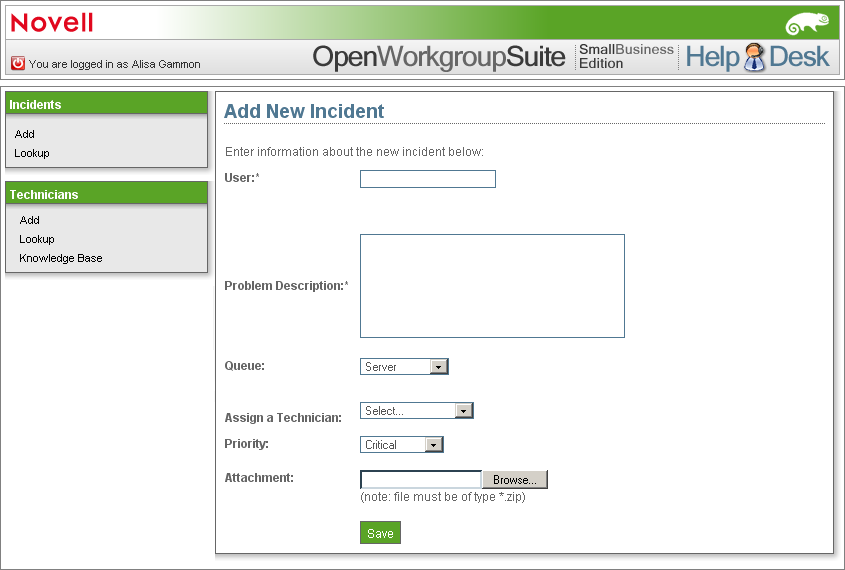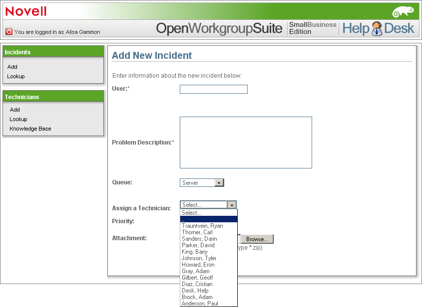 5. Im Feld Einen Techniker zuweisen können Sie den Namen des Technikers angeben, dem der Vorfall zugewiesen werden soll.