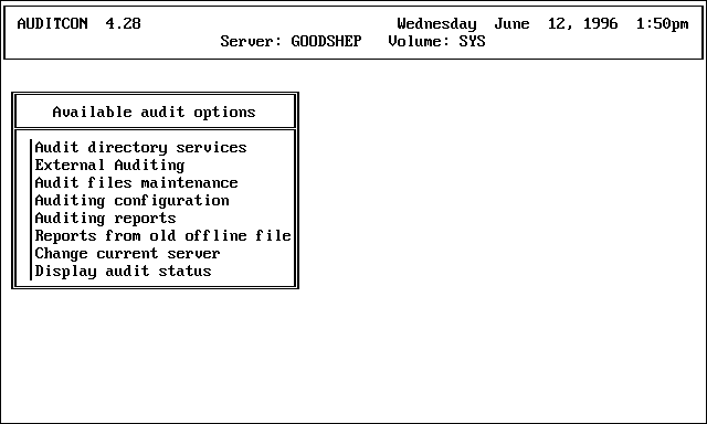 The two header lines shows the version of AUDITCON that you are running, the current date and time, and the current server and volume assigned by AUDITCON for your auditing session.
