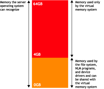 NetWare also provides a virtual memory system that swaps little-used data to disk, thereby freeing memory for more frequently used data. Applications that run in protected address spaces use virtual memory, as does Java*. The following illustration shows the amount memory the server can recognize and what portions the virtual memory system uses.