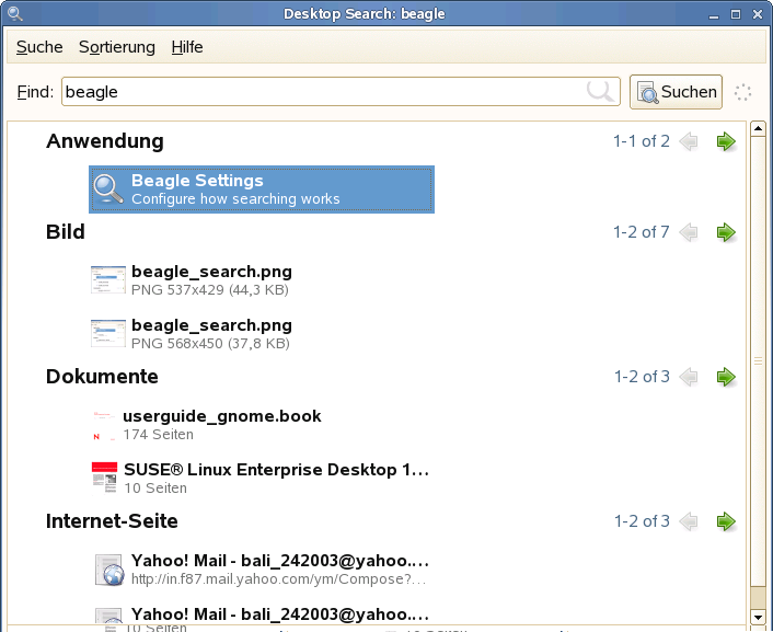 Zum Suchen nach Dateien auf Ihrem Computer klicken Sie auf , geben Sie die Suchbegriffe in das Feld ein und drücken . Das Ergebnis wird im Dialogfeld "Desktop-Suche" angezeigt.