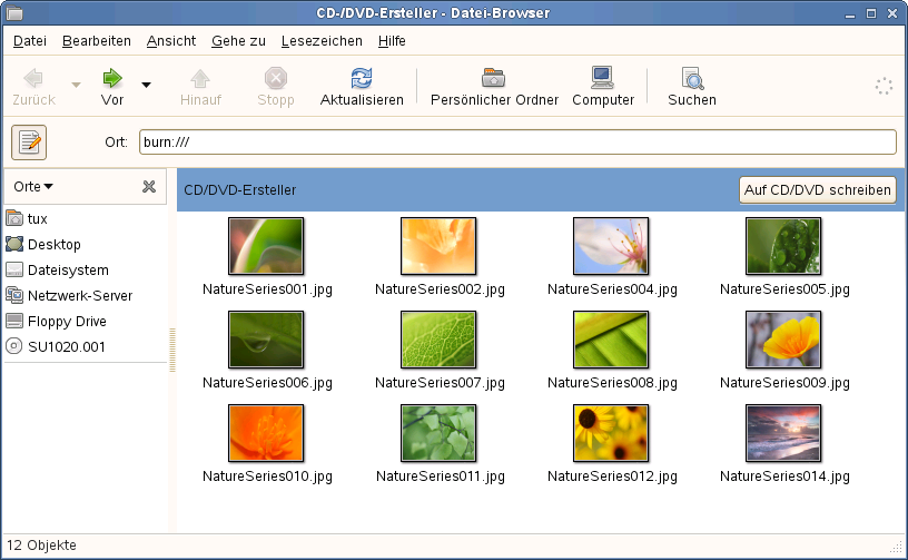 Wenn Ihr System über einen CD- oder DVD-Brenner verfügt, können Sie mithilfe des Nautilus-Datei-Managers CDs und DVDs brennen.