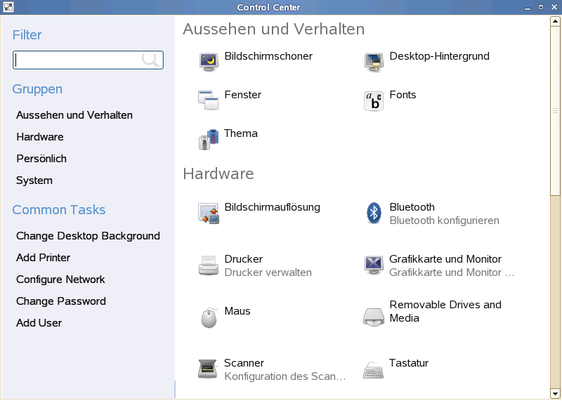In GNOME können Sie nicht nur individuelle Desktop-Elemente ändern, sondern auch Ihren Desktop ganz nach Ihren persönlichen Vorlieben anpassen. Genauere Einstellungen zum Anpassen des gesamten Aussehens und Verhaltens Ihres Desktops finden Sie im GNOME-Kontrollzentrum. Dort können Sie Schriftarten, Tastatur- und Mauskonfiguration, Länder- und Spracheinstellungen, Parameter für Ihren Internet- und Netzwerkzugang und vieles andere mehr konfigurieren.