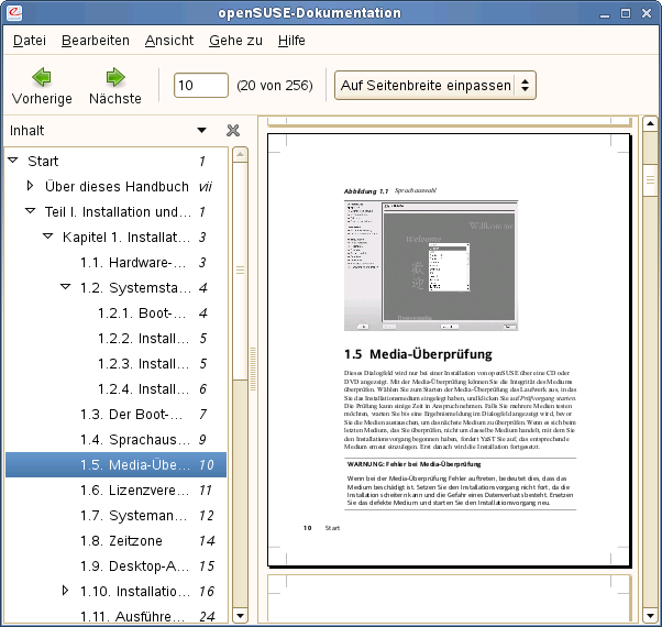Mit den Navigationssymbolen oben im Fenster können Sie durch das Dokument navigieren. Wenn Ihr PDF-Dokument Lesezeichen enthält, können Sie im linken Bereich des Viewers darauf zugreifen.