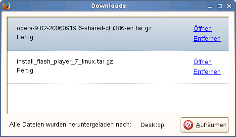 Wenn Sie eine Datei mit Firefox herunterladen, wird der Download-Manager gestartet und diese Datei wird im vorher in den Firefox-Einstellungen konfigurierten Ordner gespeichert. Standardmäßig ist Ihr Desktop der Zielordner für heruntergeladene Dateien. Firefox zeigt die fertig gestellten Downloads im Fenster an.