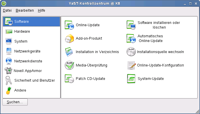 YaST enthält verschiedene Module, mit denen Sie Ihre Systemeinstellungen anpassen können. Diese Module werden in folgende Kategorien unterschieden: