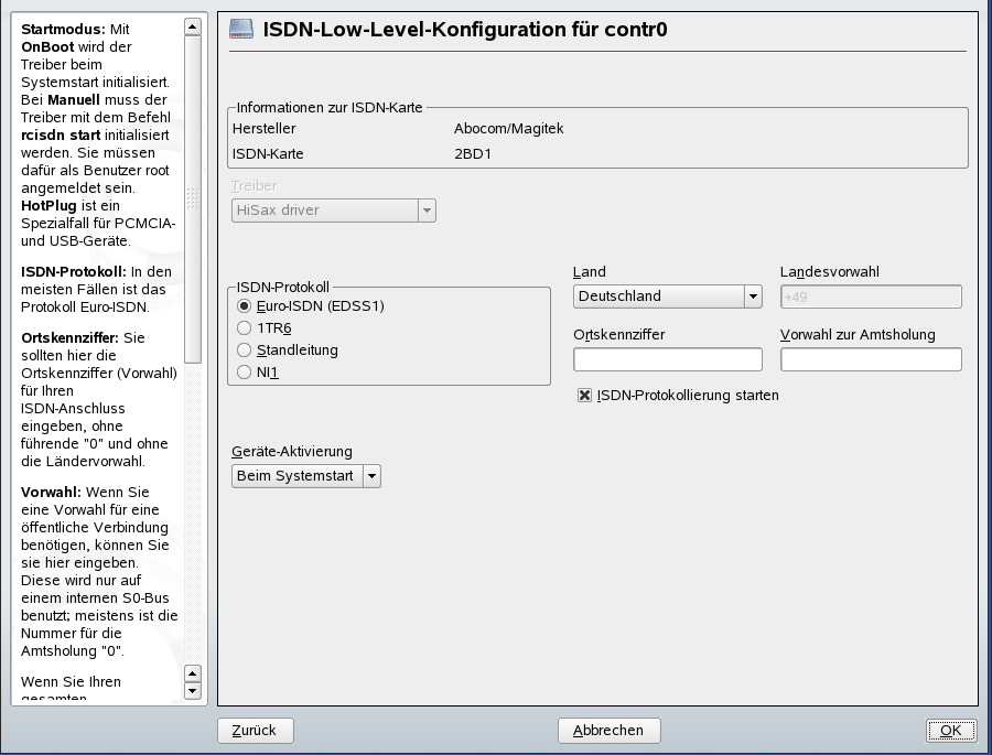 legt fest, wie die ISDN-Schnittstelle gestartet werden soll: bewirkt, dass der ISDN-Treiber bei jedem Systemstart initialisiert wird. erfordert, dass Sie den ISDN-Treiber als root mit dem Befehl rcisdn start laden. wird für PCMCIA- oder USB-Geräte verwendet. Diese Option lädt den Treiber, nachdem das Gerät eingesteckt wurde. Wenn Sie alle Einstellungen vorgenommen haben, klicken Sie auf .