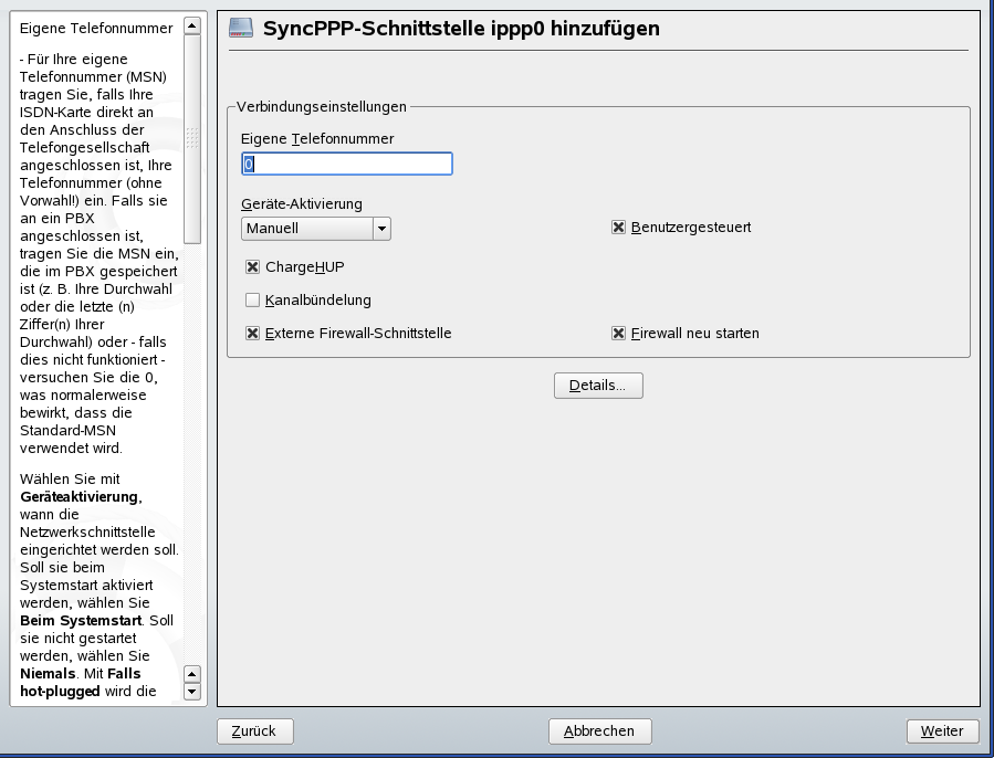 Wenn die Verbindung vor der nächsten zu zahlenden Gebühreneinheit getrennt werden soll, aktivieren Sie . Dies funktioniert unter Umständen jedoch nicht mit jedem ISP. Durch Auswahl der entsprechenden Option können Sie auch die Kanalbündelung (Multilink-PPP) aktivieren. Sie können SuSEfirewall2 für die Verbindung aktivieren, indem Sie und auswählen. Um dem normalen Benutzer ohne Administratorberechtigung das Aktivieren oder Deaktivieren der Schnittstelle zu ermöglichen, wählen Sie .