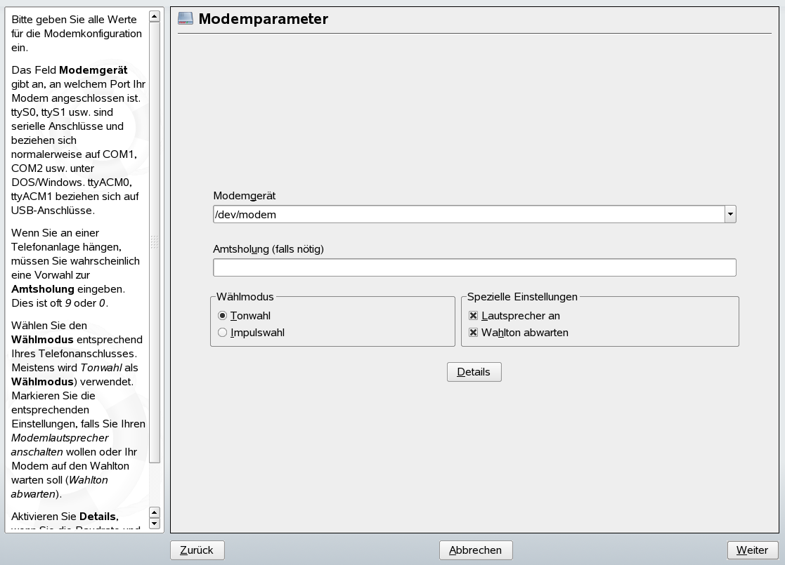 Im YaST-Kontrollzentrum greifen Sie mit auf die Modem-Konfiguration zu. Falls die automatische Erkennung fehlschlägt, öffnen Sie das Dialogfeld für die manuelle Konfiguration, indem Sie auf klicken. Geben Sie in diesem Dialogfeld unter die Schnittstelle an, mit der das Modem verbunden ist.