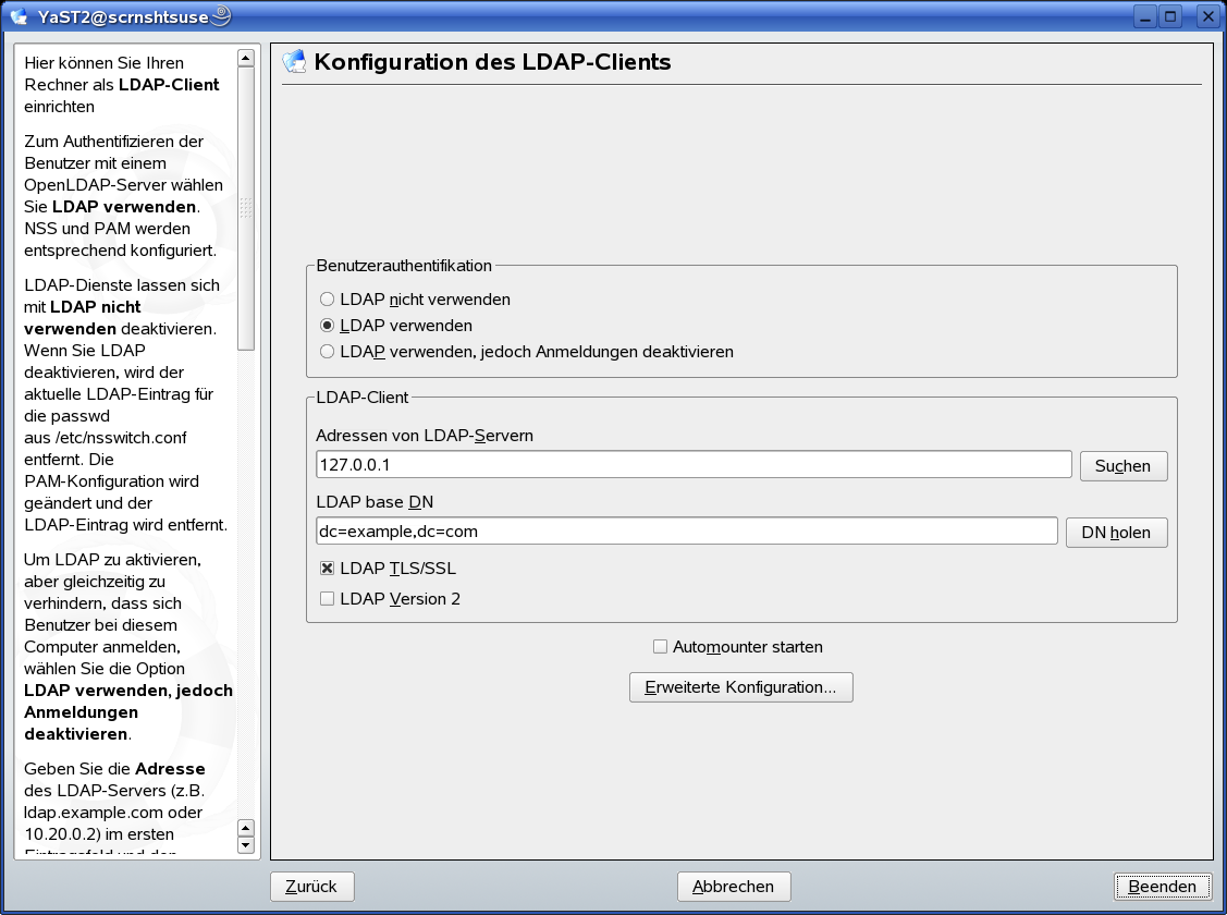 Nachdem YaST die ersten Anpassungen von nss_ldap, pam_ldap, /etc/passwd und /etc/group vorgenommen hat, können Sie einfach eine Verbindung zwischen dem Client und dem Server herstellen und die Benutzer von YaST über LDAP verwalten lassen. Das grundlegende Setup wird in Grundlegende Konfiguration beschrieben.