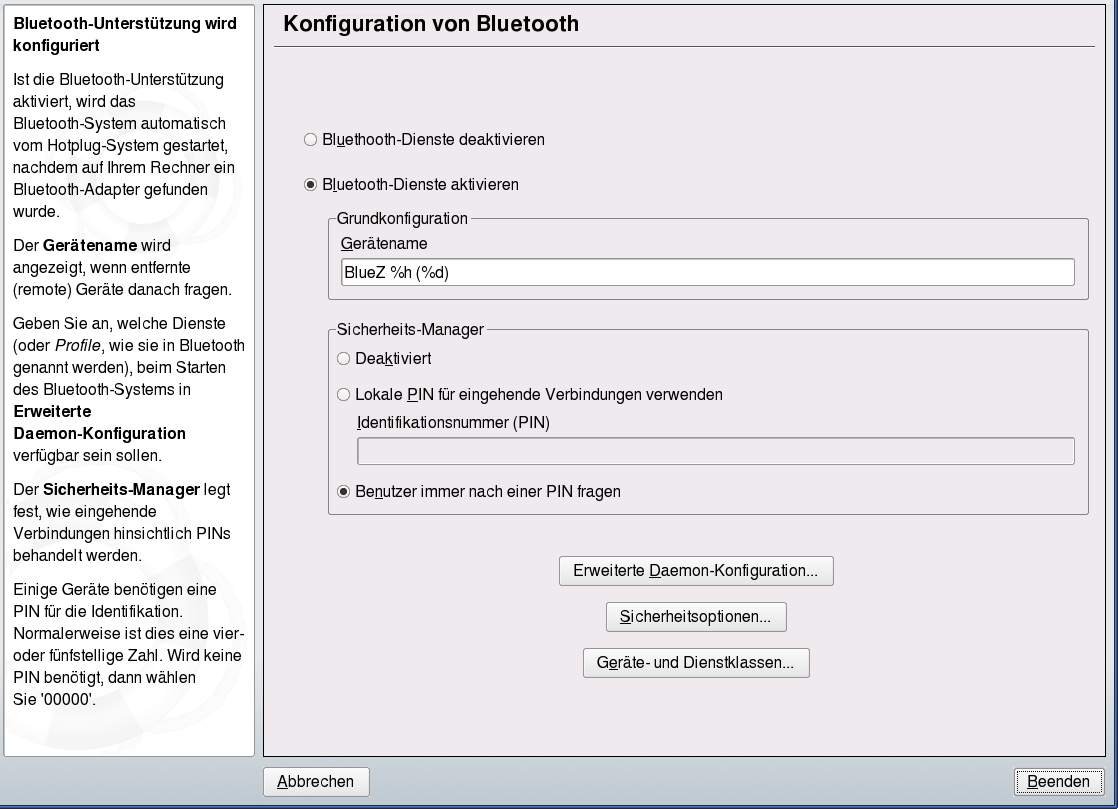 Ermitteln Sie im ersten Schritt der Konfiguration, ob Bluetooth-Dienste im System gestartet werden sollten. Wenn Sie die Bluetooth-Dienste aktiviert haben, können zwei Elemente konfiguriert werden: . Dies ist der Name, den andere Geräte anzeigen, wenn der Computer erkannt wurde. Es sind zwei Platzhalter verfügbar: %h steht für den Hostnamen des Systems (z. B. nützlich, wenn der Hostname dynamisch von DHCP zugewiesen wird) und %d fügt die Schnittstellennummer ein (nur sinnvoll, wenn der Computer mehrere Bluetooth-Adapter aufweist). Wenn Sie beispielsweise Notebook %h in das Feld eingeben und DHCP dem Computer den Namen unit123 zuweist, erkennen andere entfernte Geräte den Computer als Notebook unit123.