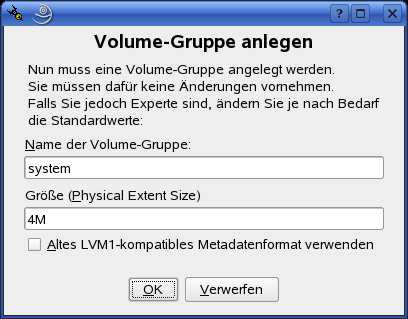 Wenn auf Ihrem System noch keine Volume-Gruppe existiert, werden Sie aufgefordert, eine anzulegen (siehe Abbildung 2-3). Zusätzliche Gruppen können mit hinzugefügt werden. Gewöhnlich ist jedoch eine Volume-Gruppe ausreichend. Als Name für die Volume-Gruppe, auf der sich die Dateien des openSUSE™-Systems befinden, wird system vorgeschlagen. Die Physical Extent Size bestimmt die maximale Größe eines physischen Blocks in der Volume-Gruppe. Der gesamte Plattenplatz in einer Volume-Gruppe wird in Blöcken dieser Größe verwaltet. Dieser Wert wird normalerweise auf 4 MB festgelegt. Dies lässt eine Maximalgröße für ein physisches und logisches Volume von 256 GB zu. Sie sollten die Physical Extent Size also nur dann erhöhen (z. B. auf 8, 16 oder 32 GB), wenn Sie größere logische Volumes als 256 GB benötigen.