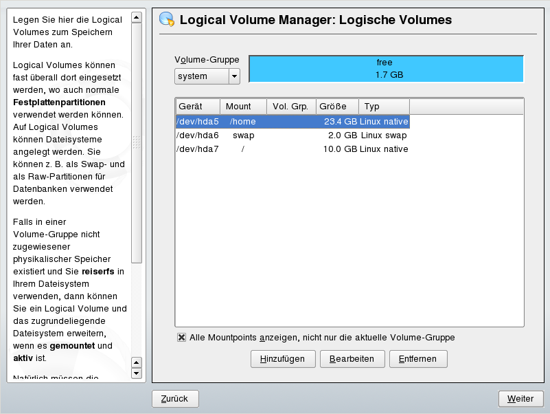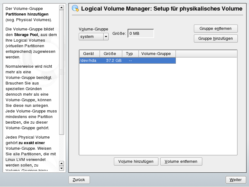 Sobald eine Volume-Gruppe angelegt wurde, listet das folgende Dialogfeld alle Partitionen auf, die entweder den Typ Linux LVM